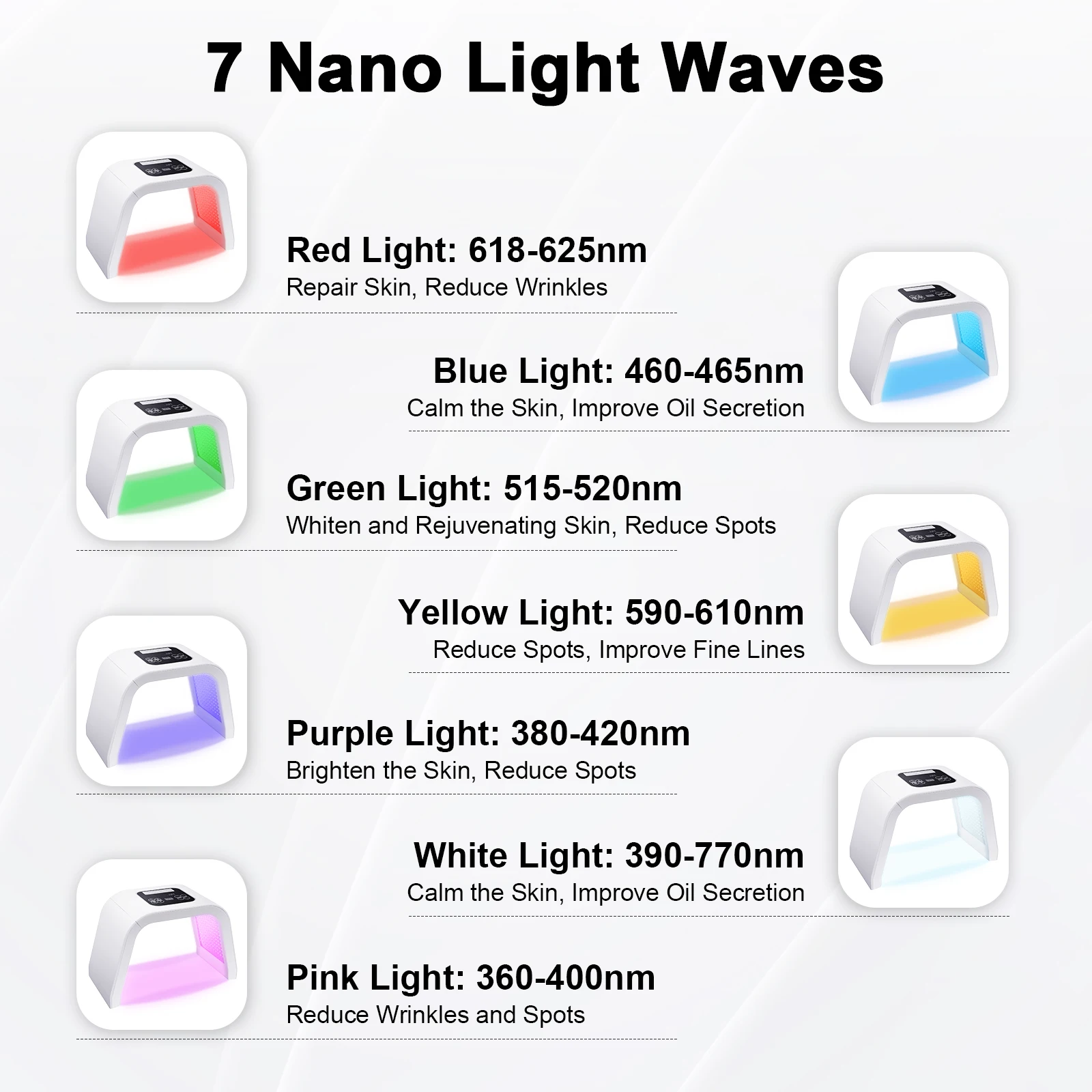 Multiple Light Types: Seven nano light waves (red, blue, green, yellow, purple, white, pink) can improve different skin problems for you, including lightening wrinkles, reducing oily skin, lightening white spots, reducing pigmentation, and so on, to achieve whitening and rejuvenating effects for you, so that you look radiant. The wavelength of the spectrum can penetrate deep into the skin tissue, and you can choose different light as you need.