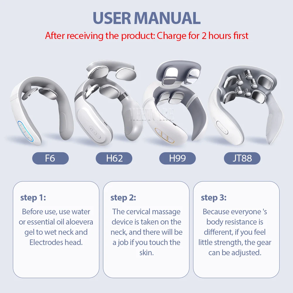 — Step 1: Before use, use water or essential oil aloe veragel to wet neck and Massager’s head.